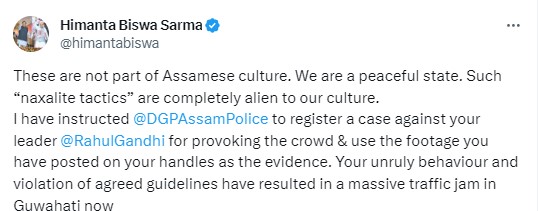 মুখ্যমন্ত্ৰী হিমন্ত বিশ্ব শৰ্মাই ‘X’ত লিখে ‘‘এইবোৰ অসমীয়া সংস্কৃতিৰ অংশ নহয়। আমি এখন শান্তিপূৰ্ণ ৰাজ্য। এনে “নক্সালীয় কৌশল” আমাৰ সংস্কৃতিৰ বাবে অচিনাকি। মই অসম আৰক্ষীৰ DGPক গোচৰ ৰুজু নিৰ্দেশ প্ৰদান কৰিছো। ৰাহুল গান্ধীয়ে সমৰ্থক উত্তেজিত কৰাৰ বাবে তেওঁৰ বিৰুদ্ধে গোচৰ ৰুজু কৰিব নিৰ্দেশ প্ৰদান কৰিছো’’(Himanta Biswa Sarma directs DGP to register case against Rahul Gandhi for ‘provoking’ crowd)।