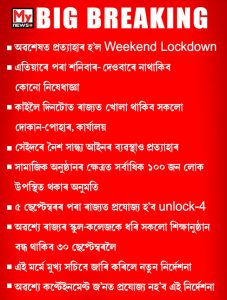 লকডাউনৰ পৰা আনলক ঘোষণা কৰাৰ লগে লগে সমগ্ৰ ৰাজ্যজুৰি কাৰ্যকৰী হৈছিল সাপ্তাহিক লকডাউন। শেহতীয়াকৈ আনলক-4.0 ঘোষণাৰ লগে লগে সাপ্তাহিক লকডাউন বাতিল কৰিছিল কেন্দ্ৰীয় চৰকাৰে। কিন্তু অসম চৰকাৰে কেন্দ্ৰৰ নিৰ্দেশনা ৪ ছেপ্তম্বৰলৈ অসম কাৰ্যকৰী নহয় বুলি কিছুদিন পুৰ্বে প্ৰকাশ কৰিছিল।