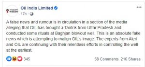 বিগত এটা দিনত চৰ্চাত আছিল যে বাঘজানৰ জুই নিৰ্বাপন কৰিবলৈ উত্তৰ প্ৰদেশৰ পৰা তান্ত্ৰিক আনিছিল। কিন্তু শেহতীয়াকৈ স্থিতি স্পষ্ট কৰিলে অইল ইণ্ডিয়াই  কৰ্তৃপক্ষই। অইল ইণ্ডিয়াৰ অফিচিয়েল ফেচবুক পেইজৰ যোগেদি স্পষ্ট কৰিছে যে বাঘজানৰ জুই নিৰ্বাপনৰ বাবে অনা হোৱা নাই কোনো তান্ত্ৰিক। অফিচিয়েল ফেচবুক পেইজত লিখিছে যে-