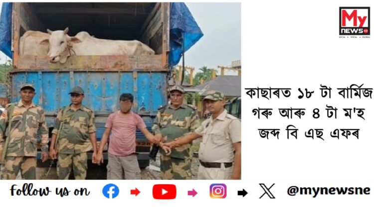 Cattle and buffaloes seized in cachar : কাছাৰত ১৮ টা বাৰ্মিজ গৰু আৰু ৪ টা ম’হ জব্দ বি এছ এফৰ