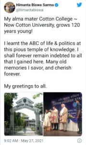 1992 চনত চিচিইউএছৰ জিএছ হিচাপে তেওঁৰ কাৰ্যকালত, কটন মহাবিদ্যালয় তদানীন্তন সভাপতি শংকৰ দয়াল শৰ্মাই ঘোষণা কৰা অনুসৰি উৎকৰ্ষ কেন্দ্ৰ হৈ পৰে আৰু ইয়াক স্নাতকোত্তৰ মহাবিদ্যালয় হোৱাৰ পথ প্ৰশস্ত কৰে।১২০তম প্ৰতিষ্ঠা দিৱসত তেওঁৰ আলমা মেটাৰৰ প্ৰতি কৃতজ্ঞতা প্ৰকাশ কৰি শৰ্মাই টুইটাৰত লিখিছে, “My alma mater Cotton College ~ Now Cotton University, grows 120 years young! I learnt the ABC of life & politics at this pious temple of knowledge. I shall forever remain indebted to all that I gained here. Many old memories I savor, and cherish forever. My greetings to all.”