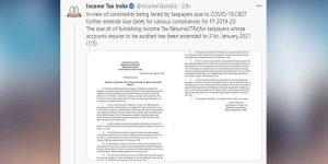 দেশত কৰ’নাই সৃষ্টি কৰা আতংকৰ ফলত এই সিদ্ধান্ত আয় কৰ বিভাগৰ৷। টুইটাৰযোগে উল্লেখ কৰিছে আয় কৰ প্ৰদানৰ অন্তিম সময়সীমা বৃদ্ধিৰ কথা। ইয়াৰ পূৰ্বে জুলাই মাহত আয় কৰ বিভাগে আয় কৰ জমা দিয়াৰ তাৰিখ ৩০ নৱেম্বৰলৈ বৃদ্ধি কৰিছে।