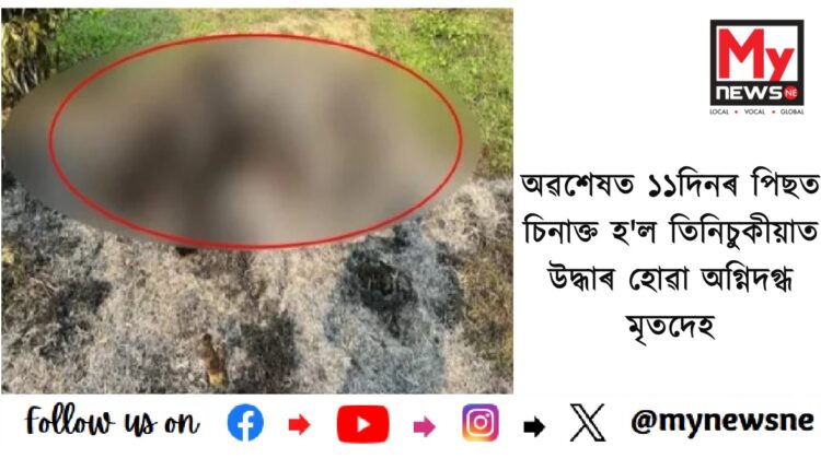 নিউজ ডেস্ক,২৭এপ্ৰিল : কচুজানৰ শুকানপুখুৰী চাহ বাগিছাত উদ্ধাৰ হোৱা মৃতদেহ চিনাক্ত । ১১ দিনৰ পিছত চিনাক্ত হ’ল অগ্নিদগ্ধ মৃতদেহটো(Miscreants set ablaze man in Tinsukia) ।