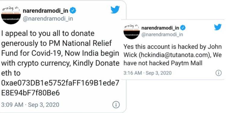 দেশত ভয়ংকৰভাৱে বৃদ্ধি পাইছে ছাইবাৰ অপৰাধৰ সংখ্যা। ছাইবাৰ অপৰাধীৰ হাতৰ পৰাই সাৰি নগ’ল প্ৰধানমন্ত্ৰী নৰেন্দ্ৰ মোদীৰ টুইটাৰ হেণ্ডল। এইবাৰ প্ৰধানমন্ত্ৰী নৰেন্দ্ৰ মোদীৰ ব্যক্তিগত টুইটাৰ একাউন্ট হেক কৰিলে দুষ্টচক্ৰই। টুইটাৰ হেণ্ডেল হেক কৰি হেকাৰে দাবী কৰিলে দান-বৰঙণি। ক’ভিডৰ বাবে প্ৰধানমন্ত্ৰীৰ সাহায্য পুঁজিত দাবী কৰিলে দান-বৰঙণি। হেক কৰা গ্ৰুপটোৰ নাম জন উইক বুলি জানিব পৰা গৈছে। ইতিমধ্যে হেকাৰে ডিলিট কৰিছে দান-বৰঙণি দাবী কৰা বিশেষ টুইটতো।