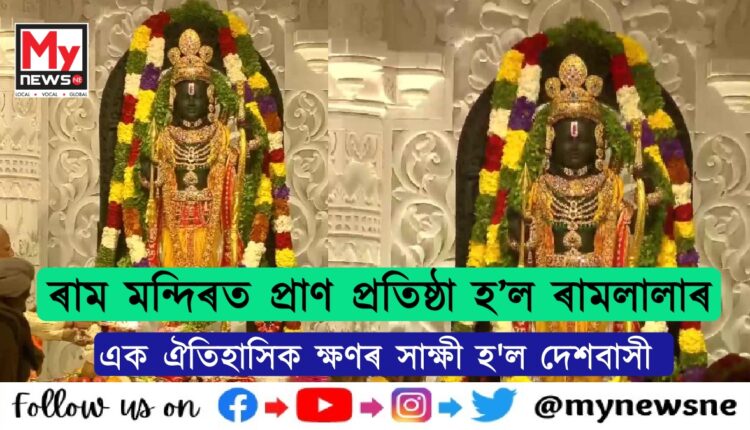 নিউজ ডেস্ক, ২২জানুৱাৰী : এক ঐতিহাসিক ক্ষণৰ সাক্ষী হ’ল দেশবাসী। ৰাম মন্দিৰৰ গৰ্ভগৃহত ৰামলালাৰ প্ৰাণ প্ৰতিষ্ঠা। পোনপ্ৰথমবাৰৰ বাবে ৰাম মন্দিৰত দেখা গ’ল ৰামলালাৰ মূৰ্ত্তি। ৫৫০ বছৰীয়া পৰিক্ৰমাৰ অন্তত অৱশেষত অযোধ্যালৈ আহিল ৰাম( Ram Lalla idol at the Shri Ram Janmaboomi Temple in Ayodhya)।