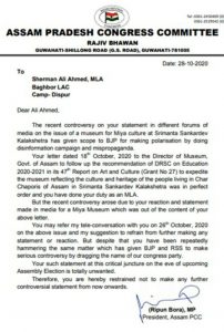 প্ৰদেশ কংগ্ৰেছৰ সভাপতিগৰাকীয়ে লিখা এই পত্ৰত লিখিত ভাৱে তেওঁক মিঞা মিউজিয়ামৰ সন্দৰ্ভত কোনো মন্তব্য প্ৰকাশ নকৰিবলৈ নিৰ্দেশ দিয়াৰ পাছতো শ্বেৰমান আলীয়ে মনা নাই কংগ্ৰেছ নেতৃত্বৰ সেই নিৰ্দেশ।