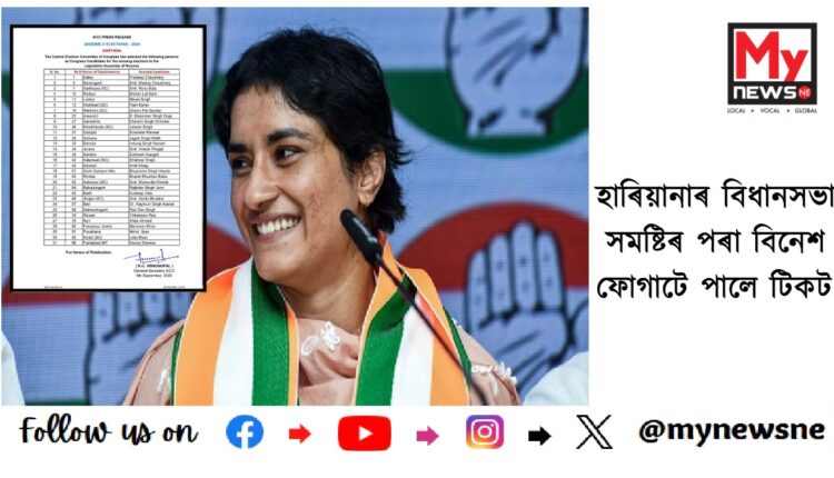 নিউজ ডেস্ক,৭ছেপ্তেম্বৰ : কংগ্ৰেছত যোগদান কৰাৰ পিছতে বিনেশ ফোগাটক হাৰিয়ানাৰ বিধানসভা সমষ্টিৰ প্ৰাৰ্থী হিচাপে টিকট প্ৰদান কৰিলে কংগ্ৰেছে।