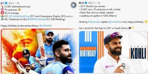 ৩২বছৰত ভৰি দিলে ক্ৰিকেট তাৰকা কিং কোহলীয়ে। ভাৰতীয় ক্ৰিকেট দলৰ অধিনায়ক বিৰাট কোহলীৰ ওপজা দিনটোত বিশেষভাবে শুভেচ্ছা জনাইছে BCCI আৰু ICC য়ে। ২০১১ বিশ্বকাপ ক্ৰিকেটত কোহলীৰ কিছু স্মৰণীয় মুহূৰ্তৰ এটি ভিডিঅ’ প্ৰস্তুত কৰি টুইটাৰৰ জৰিয়তে বিৰাট কোহলীক জন্মদিনৰ শুভেচ্ছা জনাইছে ICC য়ে। আনহাতে BCCI য়ে কোহলীৰ ২০১১ চনৰ কিছু সুন্দৰ থেল প্ৰদৰ্শনৰ মূহূৰ্তৰ কথা উল্লেখ কৰি টুইটাৰযোগে বিৰাট কোহলীক জনাইছে জন্মদিনৰ শুভেচ্ছা।